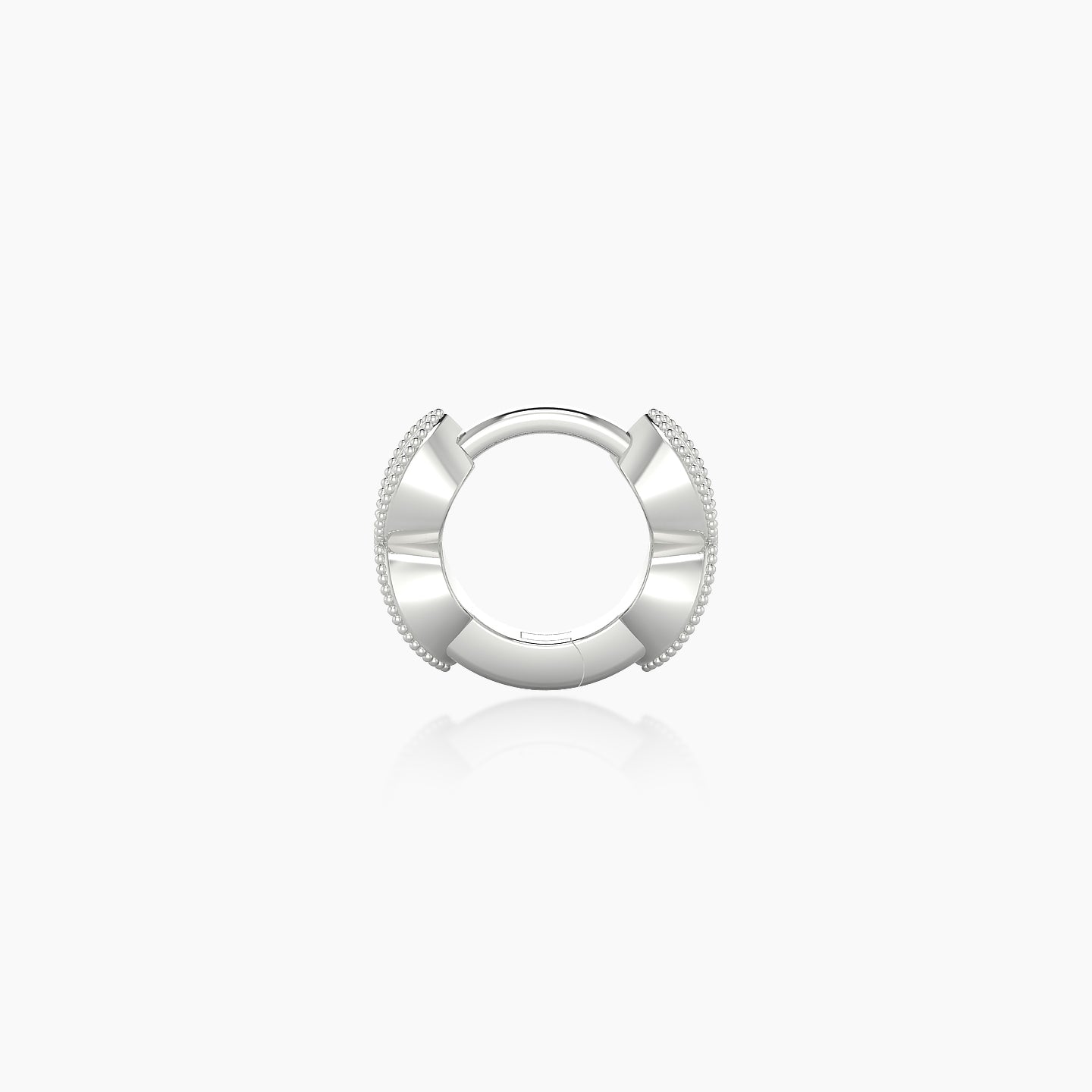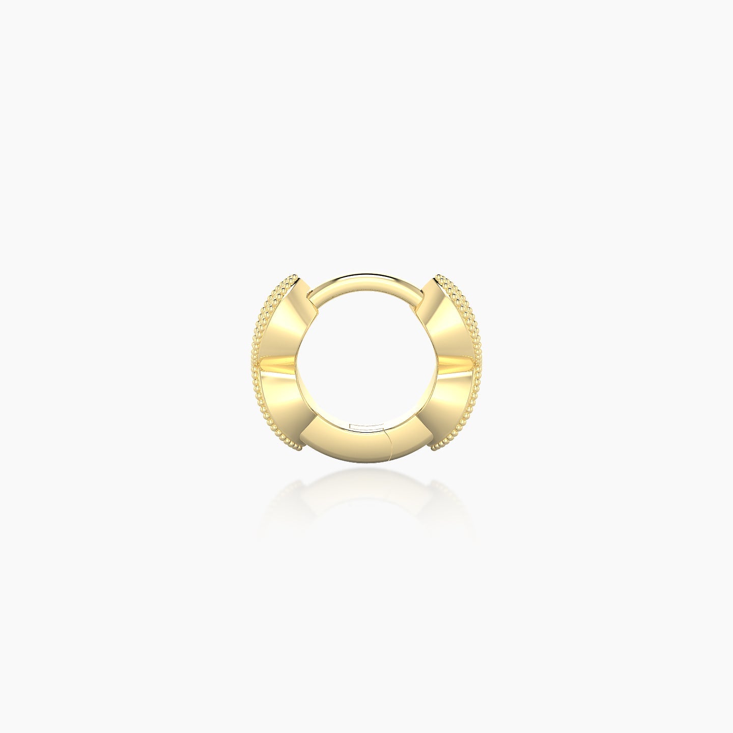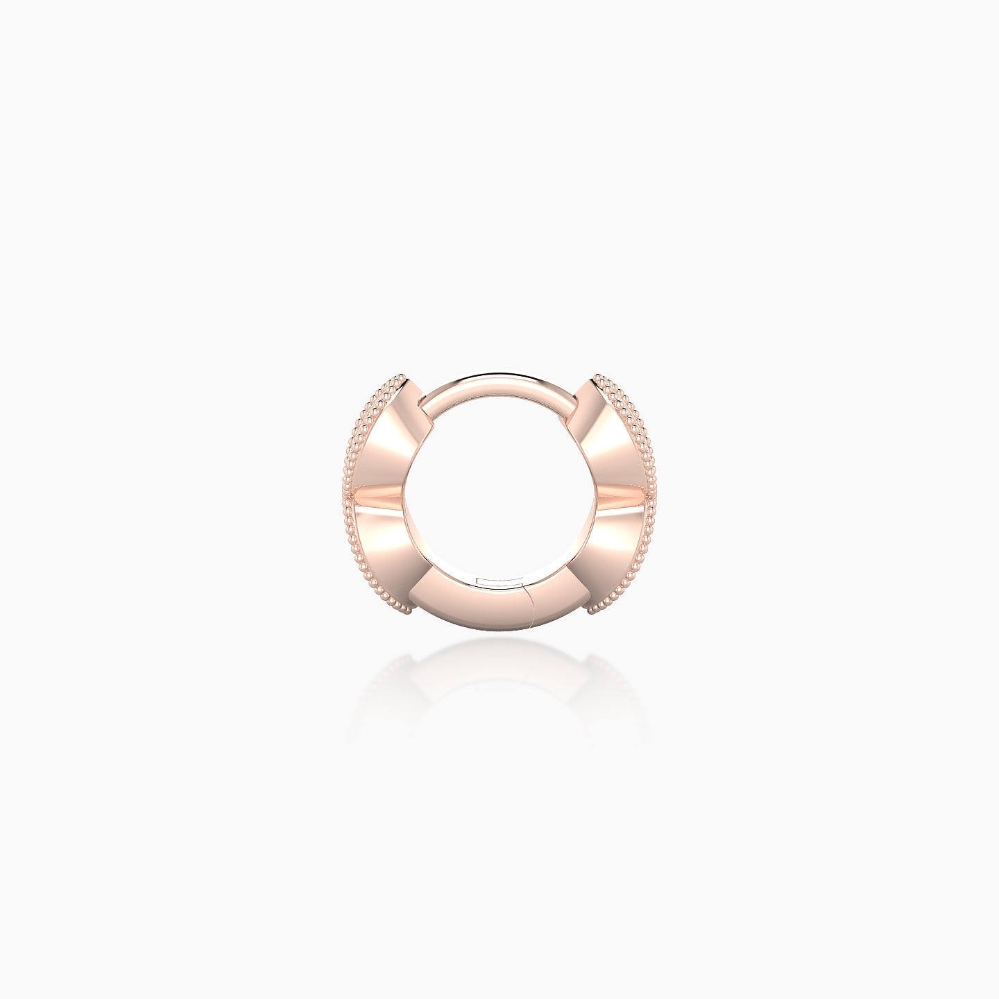 Bellona is an 18k gold hoop piercing, available in yellow, white, or rose gold. Equipped with a clicker clasp, it offers a reliable and subtle closure. This hoop is set with natural diamonds, of round shape, of G - VS quality. This piercing is suitable for the lobe, helix, anti-helix, conch, contraconch, rook, tragus, and antitragus.