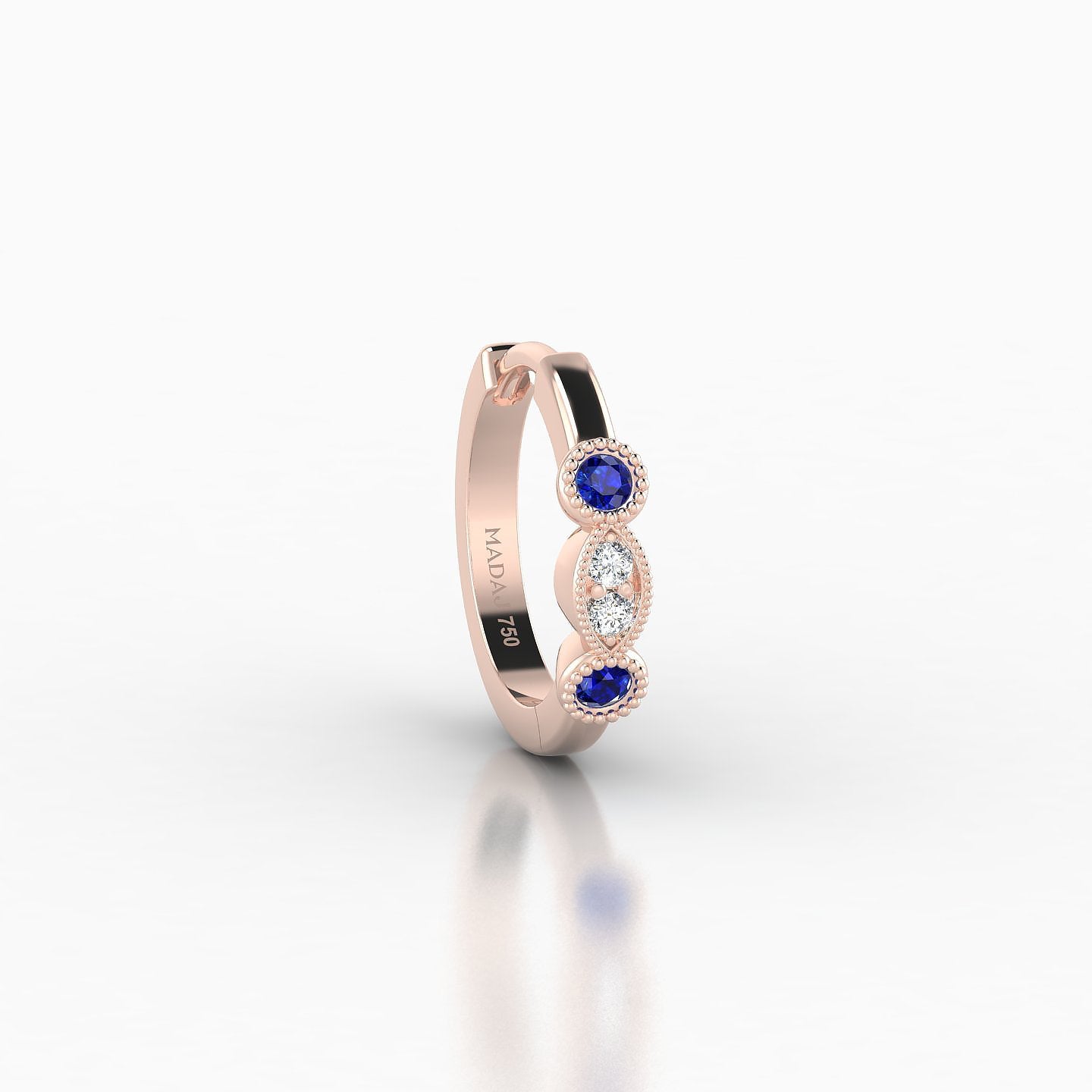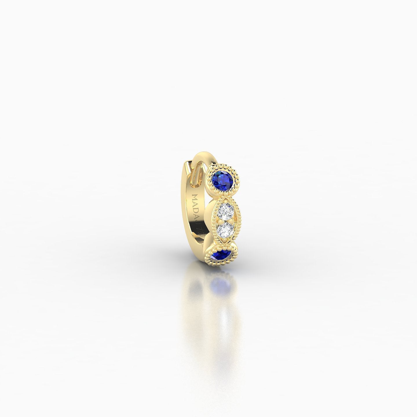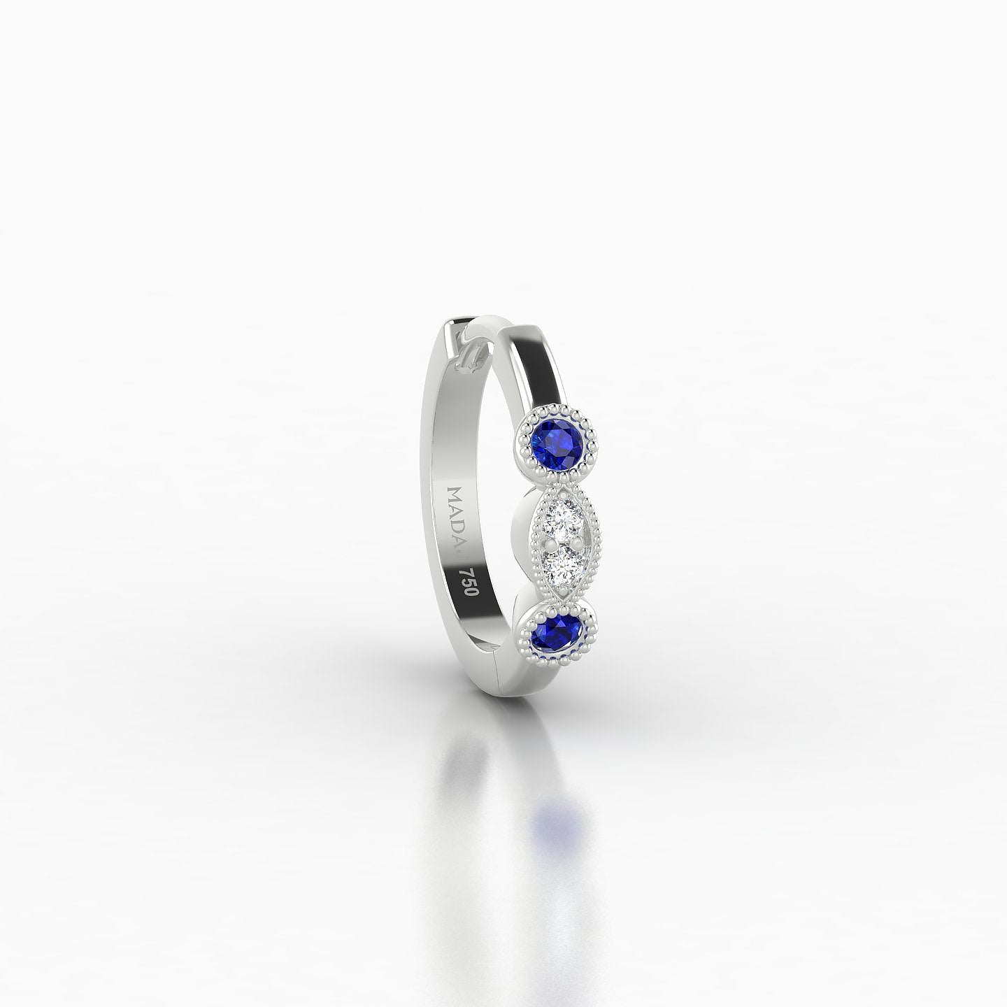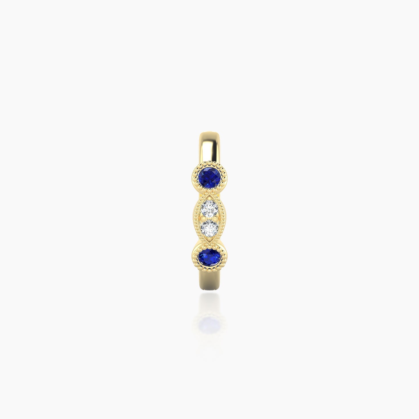 Camilla is a hoop made of 18k gold, offered in yellow, white, or rose gold. It features a clicker closure, ensuring a secure and discreet fastening. It is adorned with natural sapphires and diamonds, of round shape, of AAA and G - VS quality. This piercing can be worn on the lobe, helix, anti-helix, conch, contraconch, rook, tragus, or antitragus.