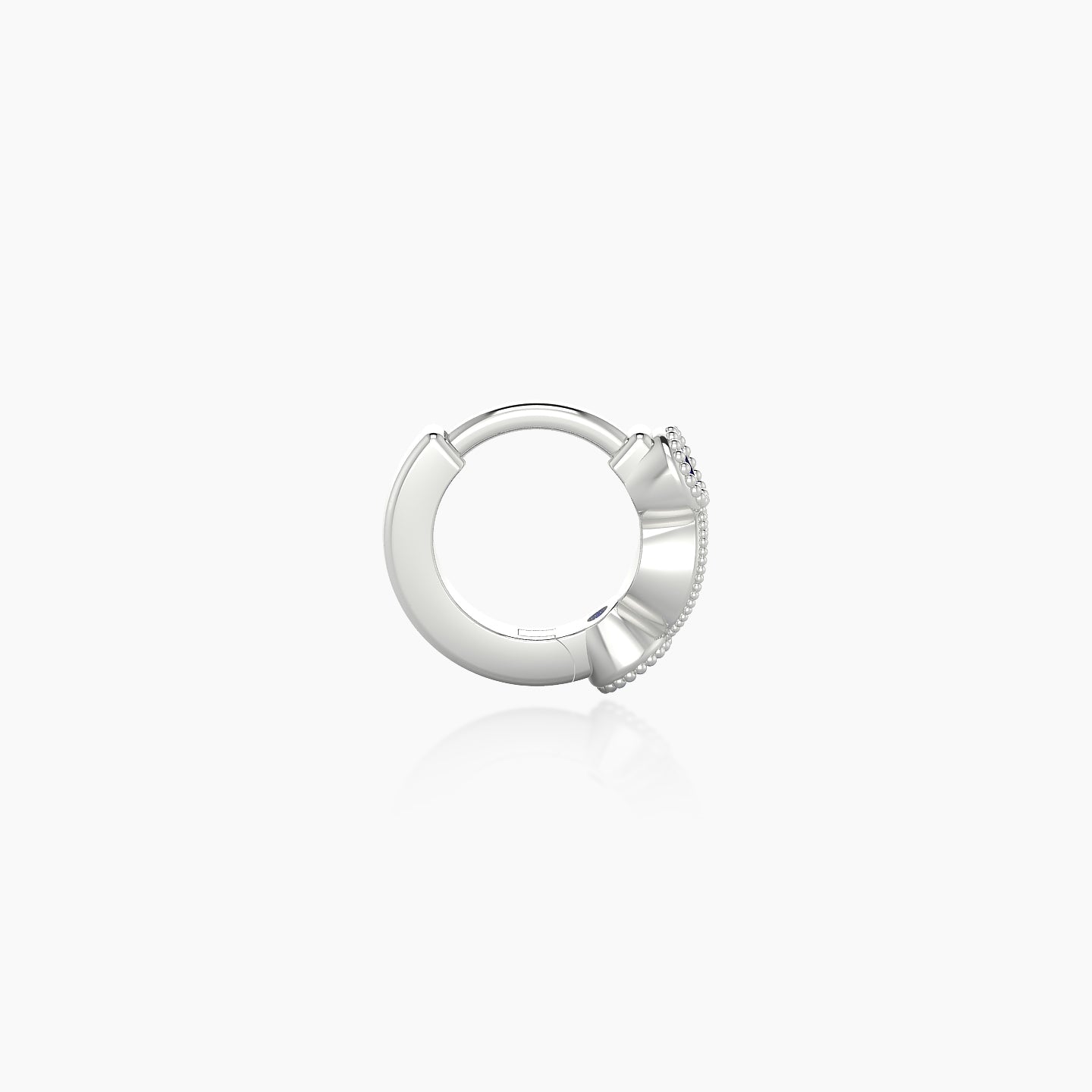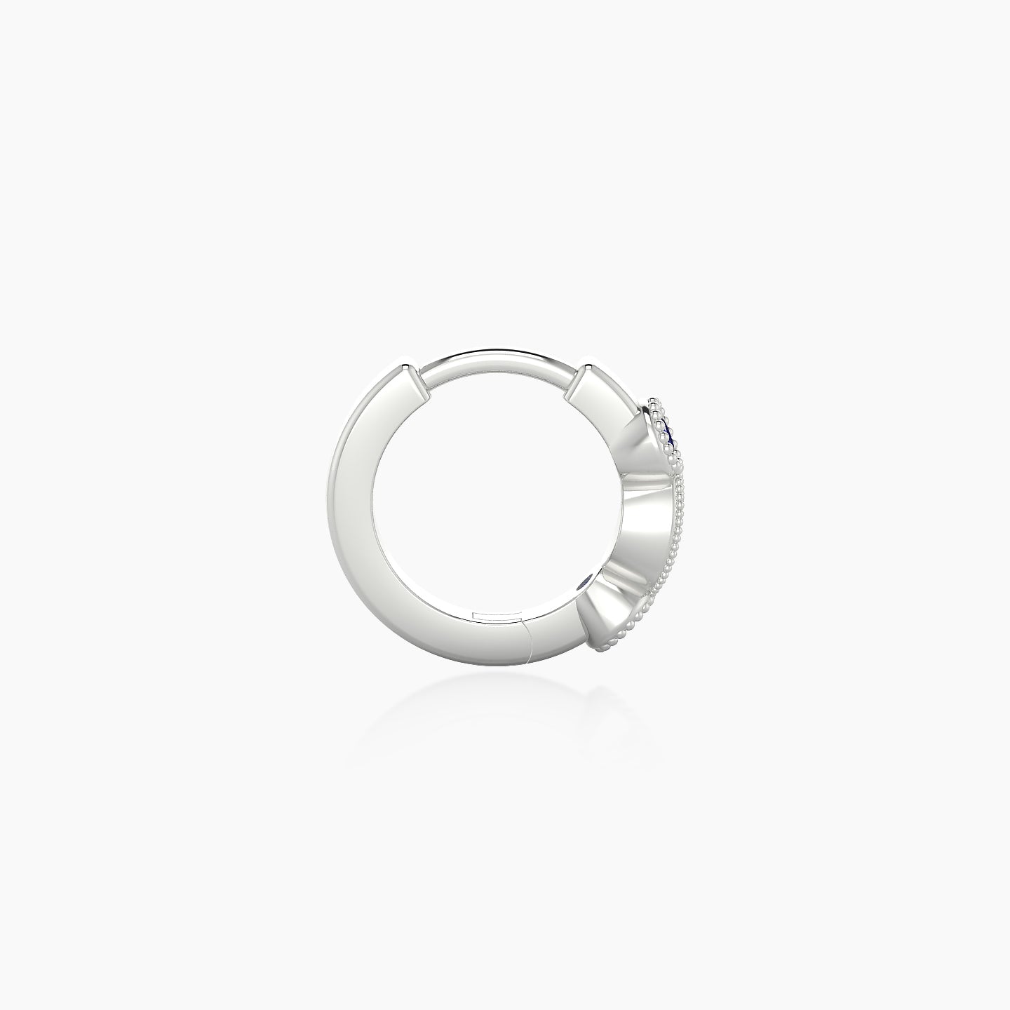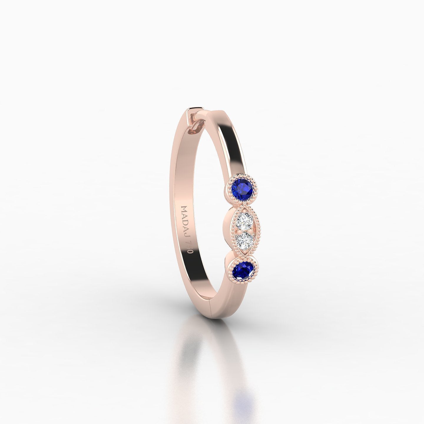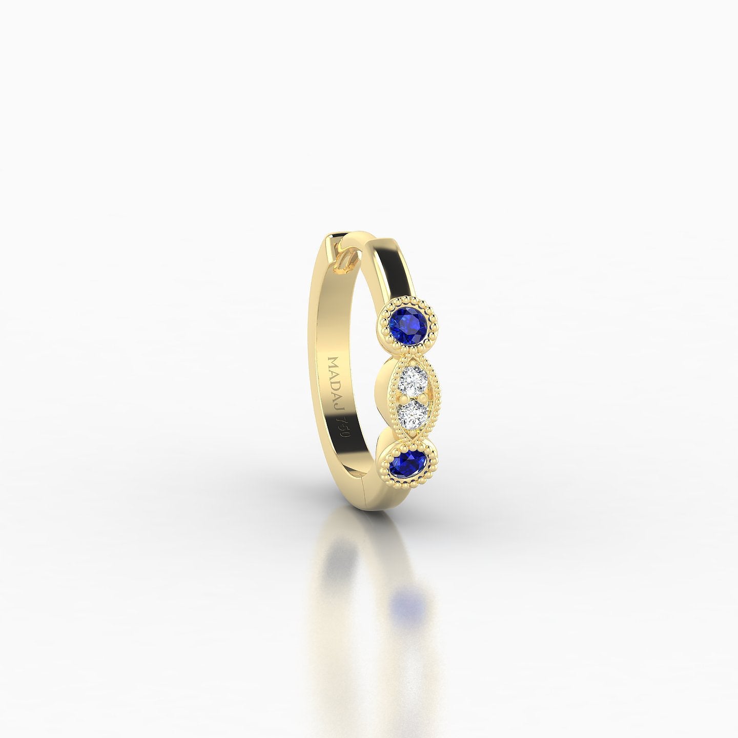 Camilla is a hoop made of 18k gold, offered in yellow, white, or rose gold. It features a clicker closure, ensuring a secure and discreet fastening. It is adorned with natural sapphires and diamonds, of round shape, of AAA and G - VS quality. This piercing can be worn on the lobe, helix, anti-helix, conch, contraconch, rook, tragus, or antitragus.