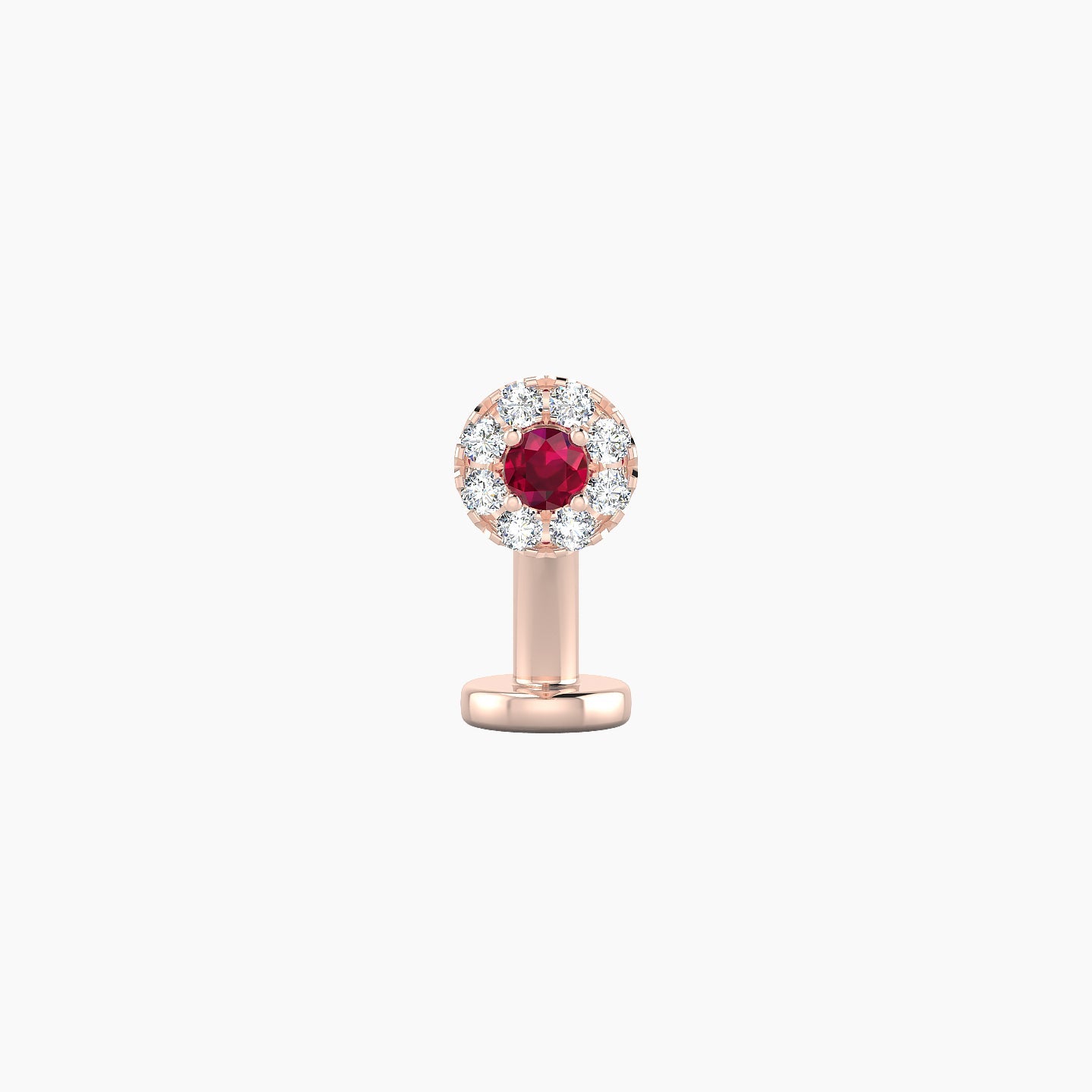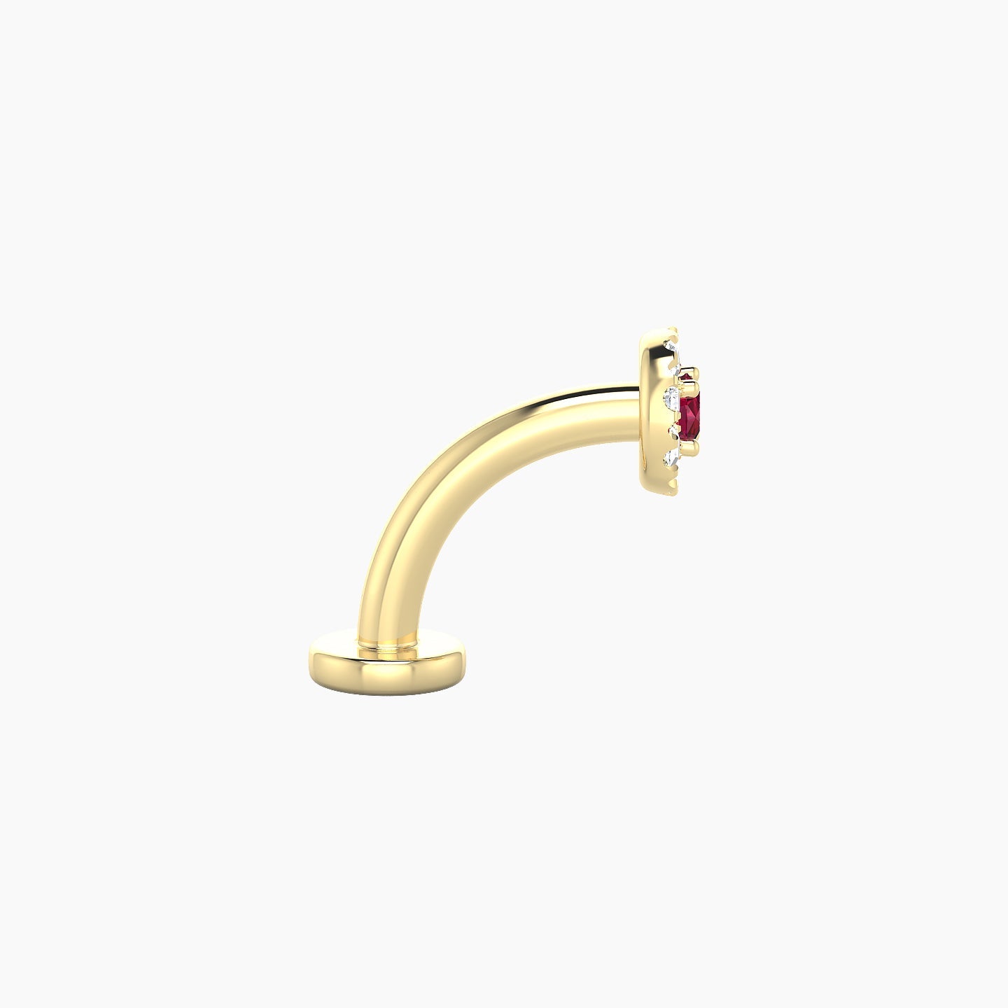 This floating belly piercing, Eirene, is made of 18k gold and comes in yellow, white, or rose. It features a screw-back closure for a secure fit. It features natural rubies and diamonds, round shape of AAA and G - VS quality. Designed for the navel, this model highlights the top stone by placing it above the bar.