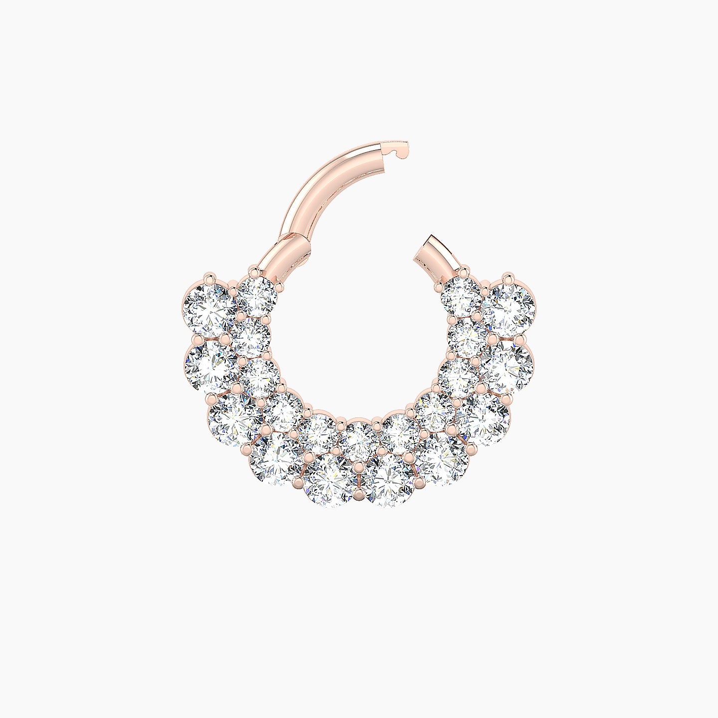 This 18k gold septum piercing, called Galia, comes in your choice of yellow, white, or rose gold. Its integrated clicker system ensures a stable and reliable closure for continuous wear. This piercing is set with natural diamonds of round shape, of G - VS quality. This piercing is designed exclusively for septum placement.