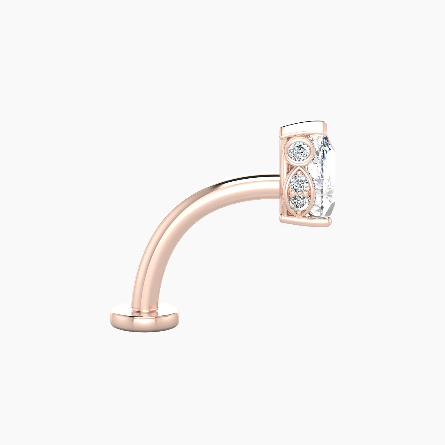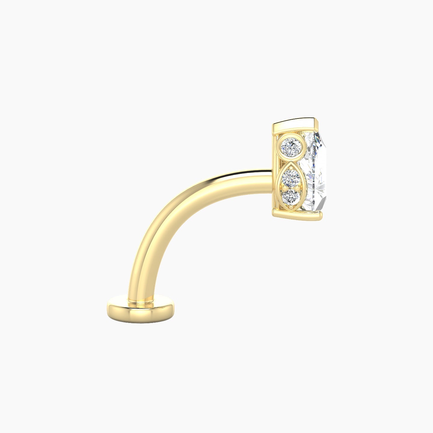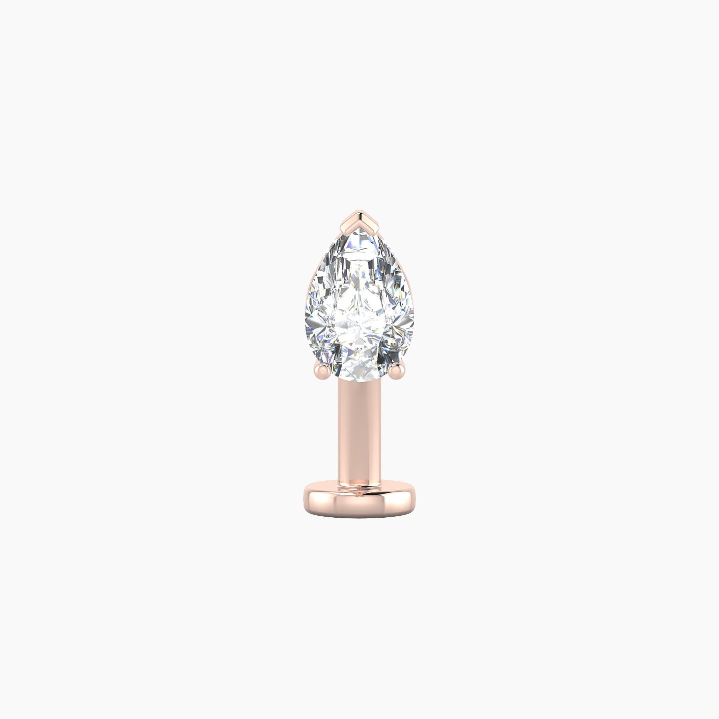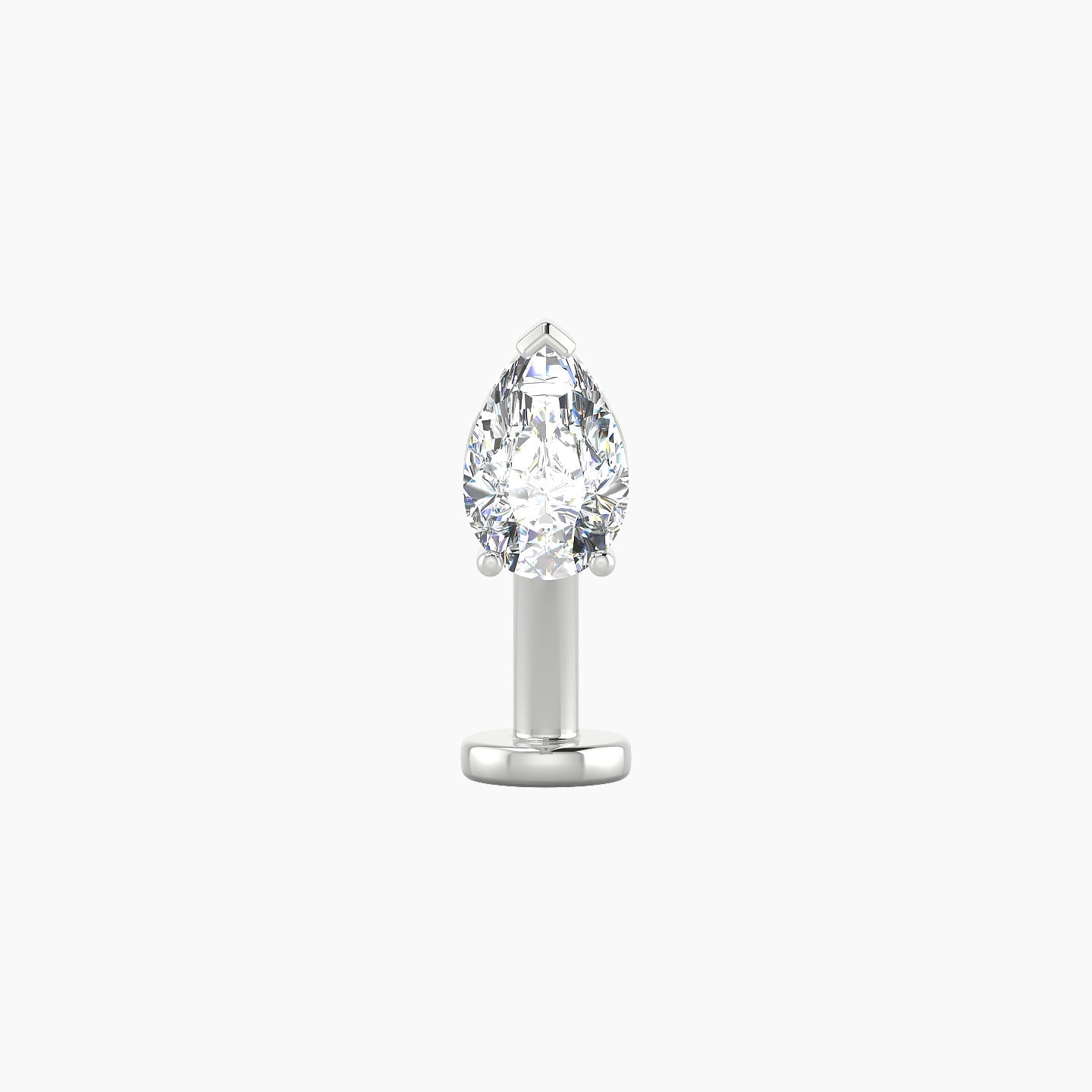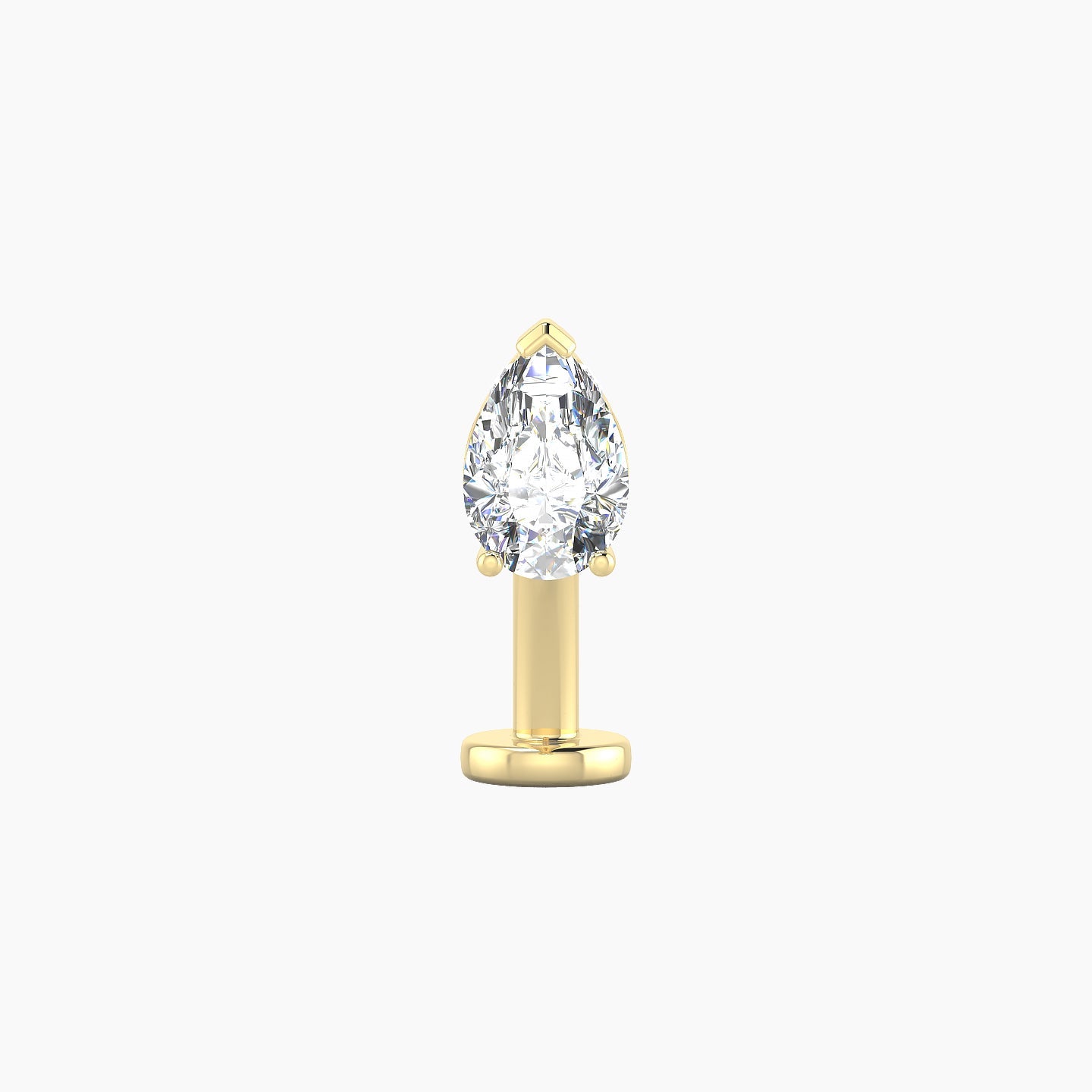 Livia is a floating belly button piercing in 18k gold, available in yellow, white, or rose gold. It features a screw-back closure for a secure fit. The piercing is adorned with pear and round shapes natural diamonds of G - VS quality. Designed for the navel, this model highlights the top stone by placing it above the bar.