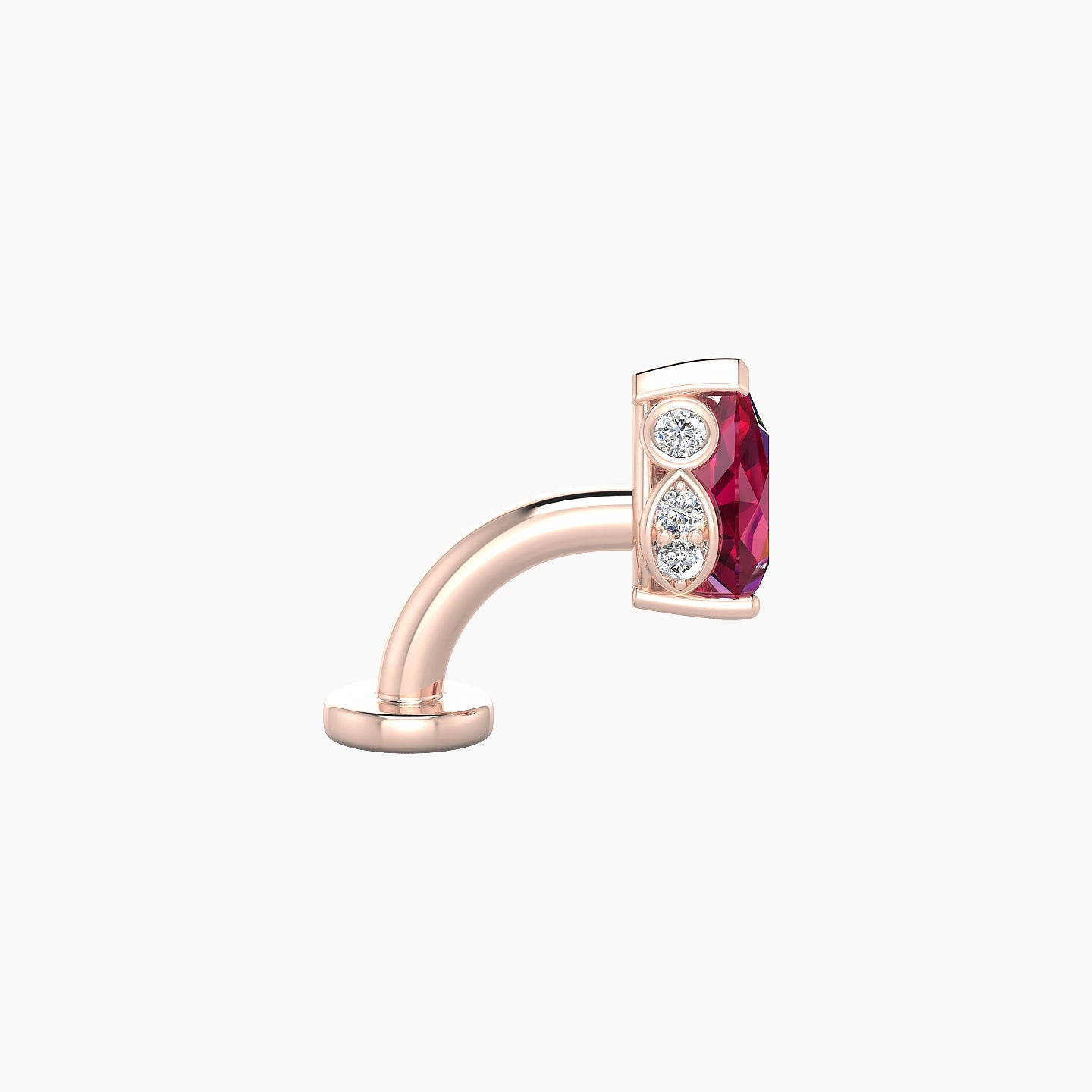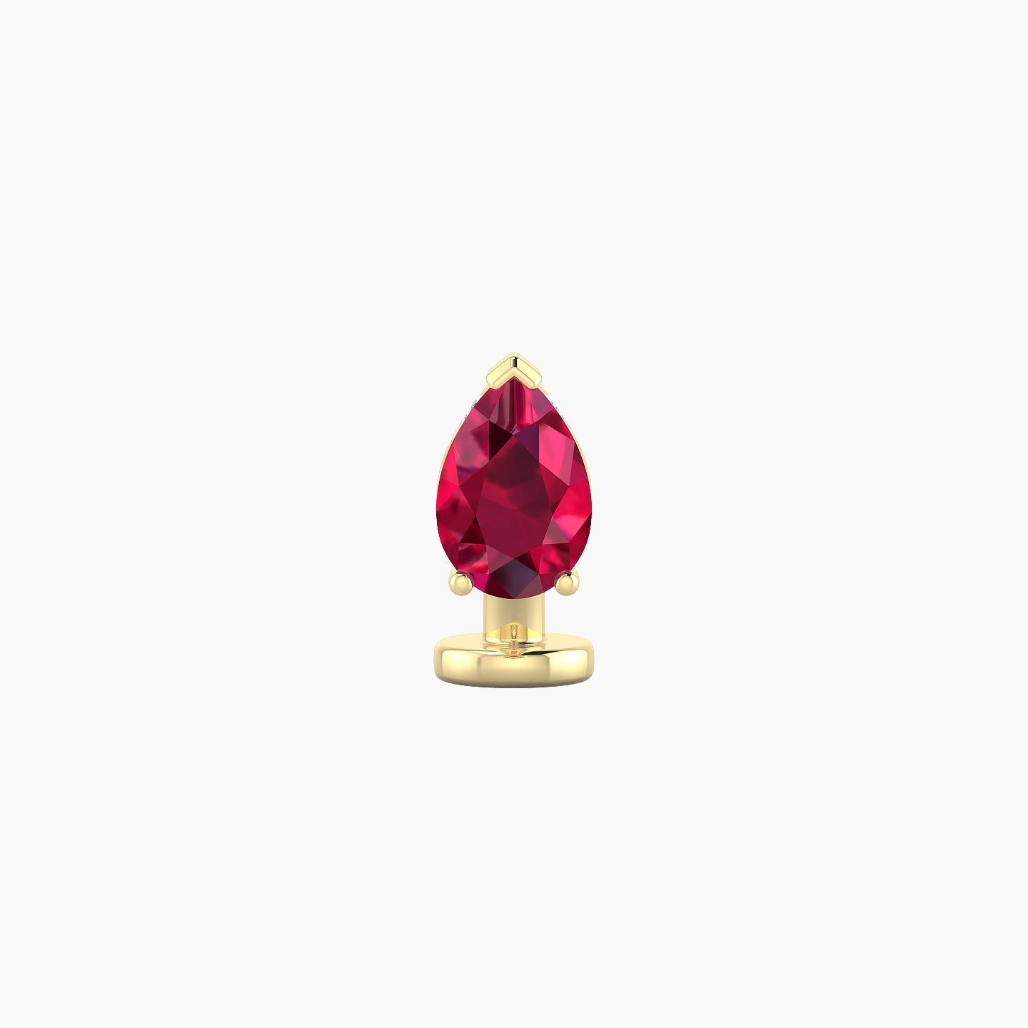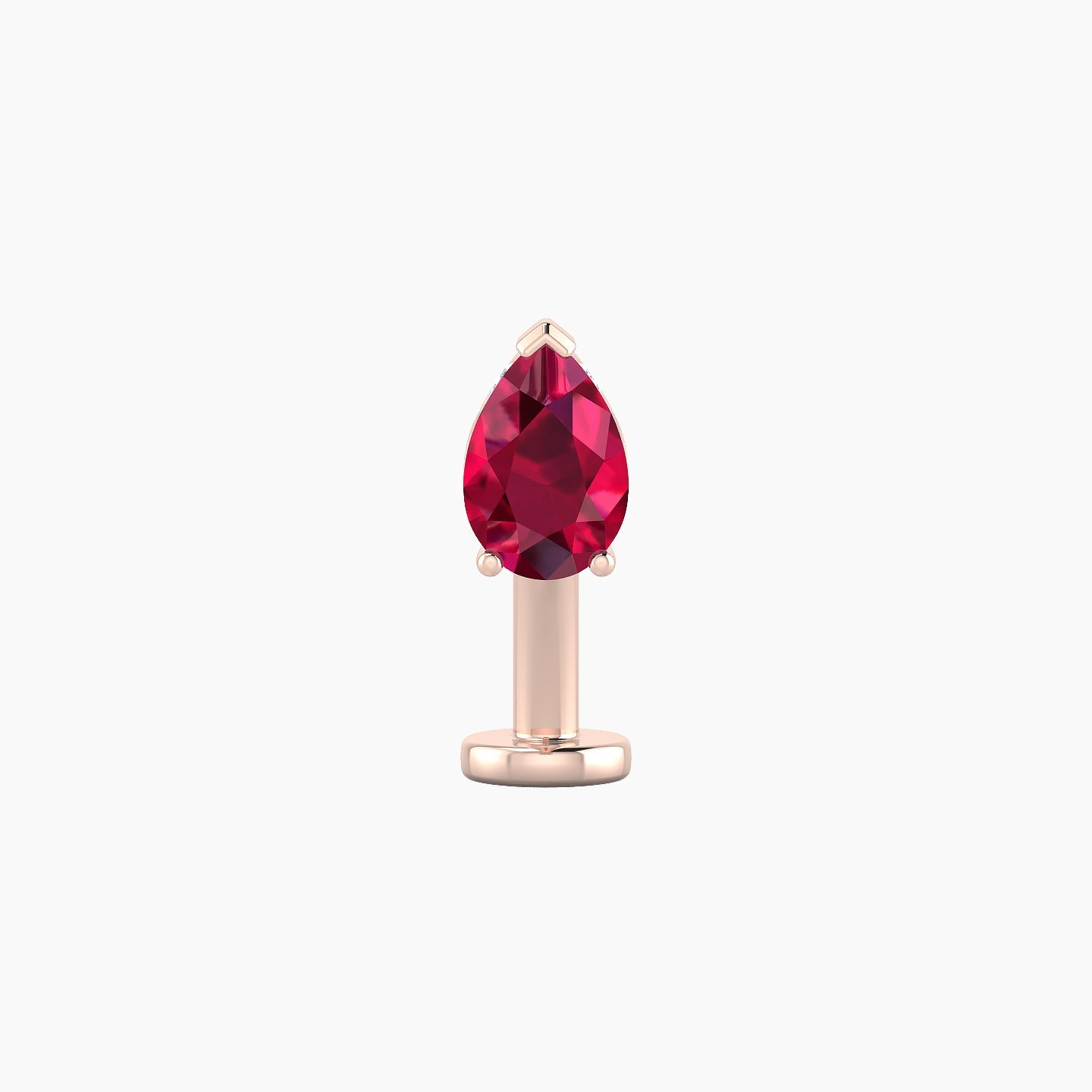 This floating belly piercing, Livia, is made of 18k gold and comes in yellow, white, or rose. It comes with a screw closure system. It features natural rubies and diamonds, pear and round shapes of AAA and G - VS quality. The floating design raises the top stone above the bar for a striking effect.