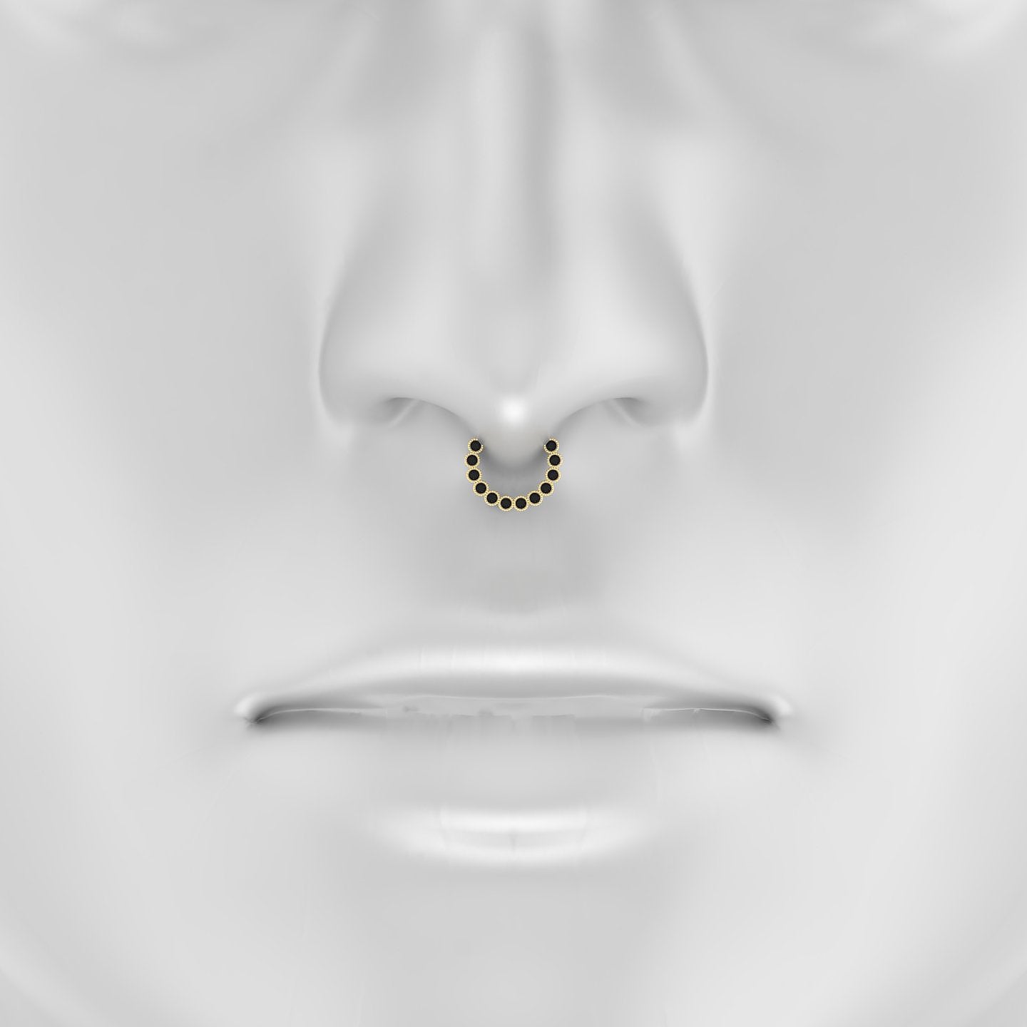 Crafted in 18k gold, Naya is a septum piercing offered in yellow, white, or rose. Designed with a discreet and durable clicker mechanism, this piercing is built to stay in place. The piercing is adorned with hand-selected natural round shape natural black diamonds of AAA quality. Specifically created for the septum, this piercing offers a tailored fit.