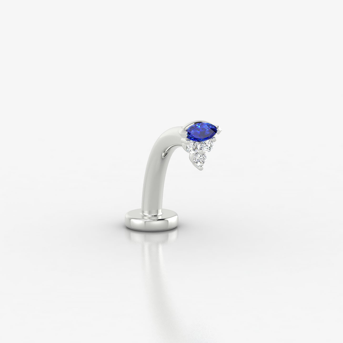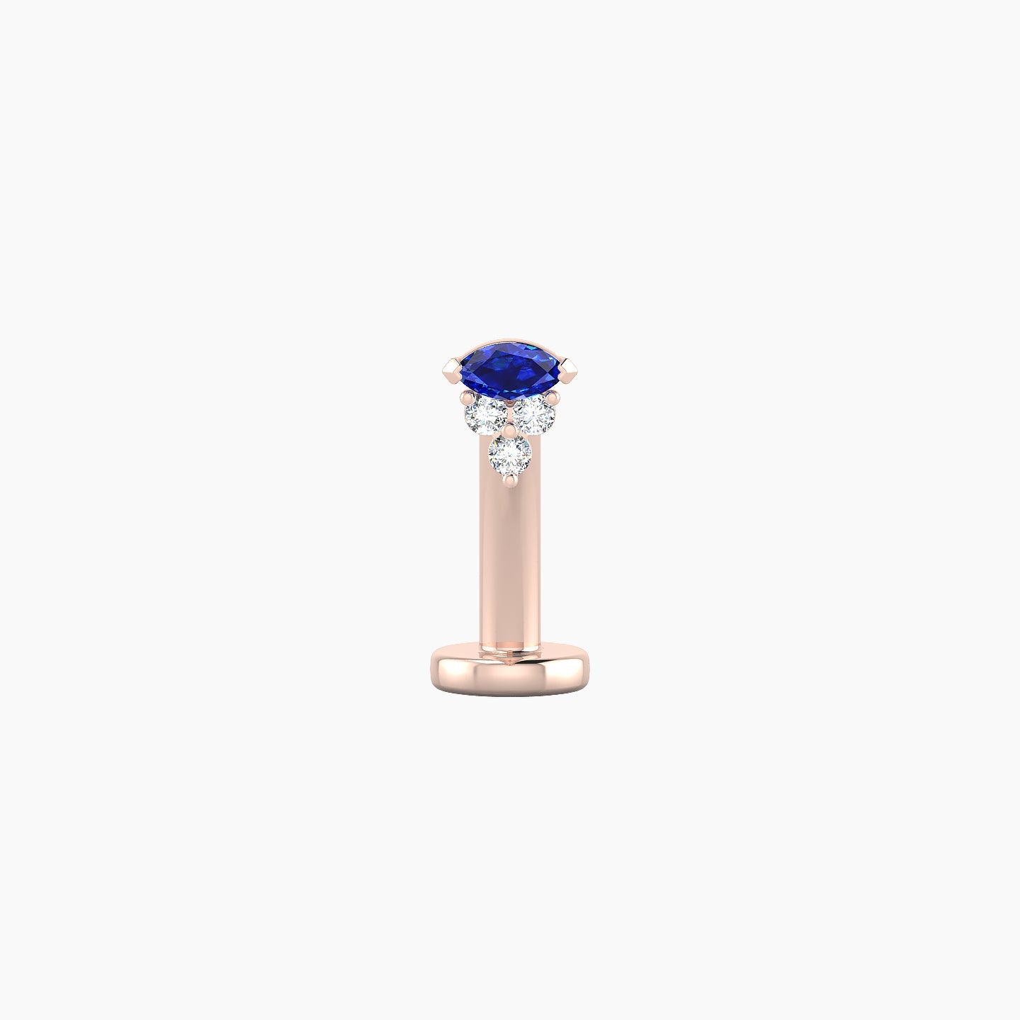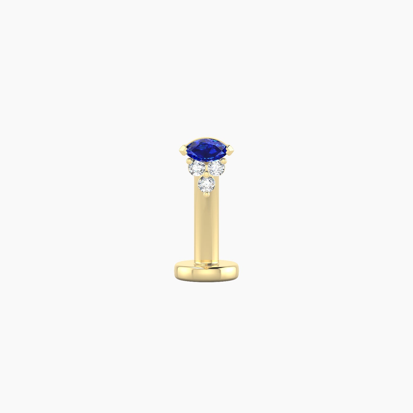 Crafted in 18k gold, Oya is a floating-style navel piercing offered in yellow, white, or rose tones. This model is equipped with a screw fastening. The piercing is adorned with marquise and round shapes natural sapphires and diamonds of AAA and G - VS quality. This piece is made for belly wear and showcases the upper stone above the post.