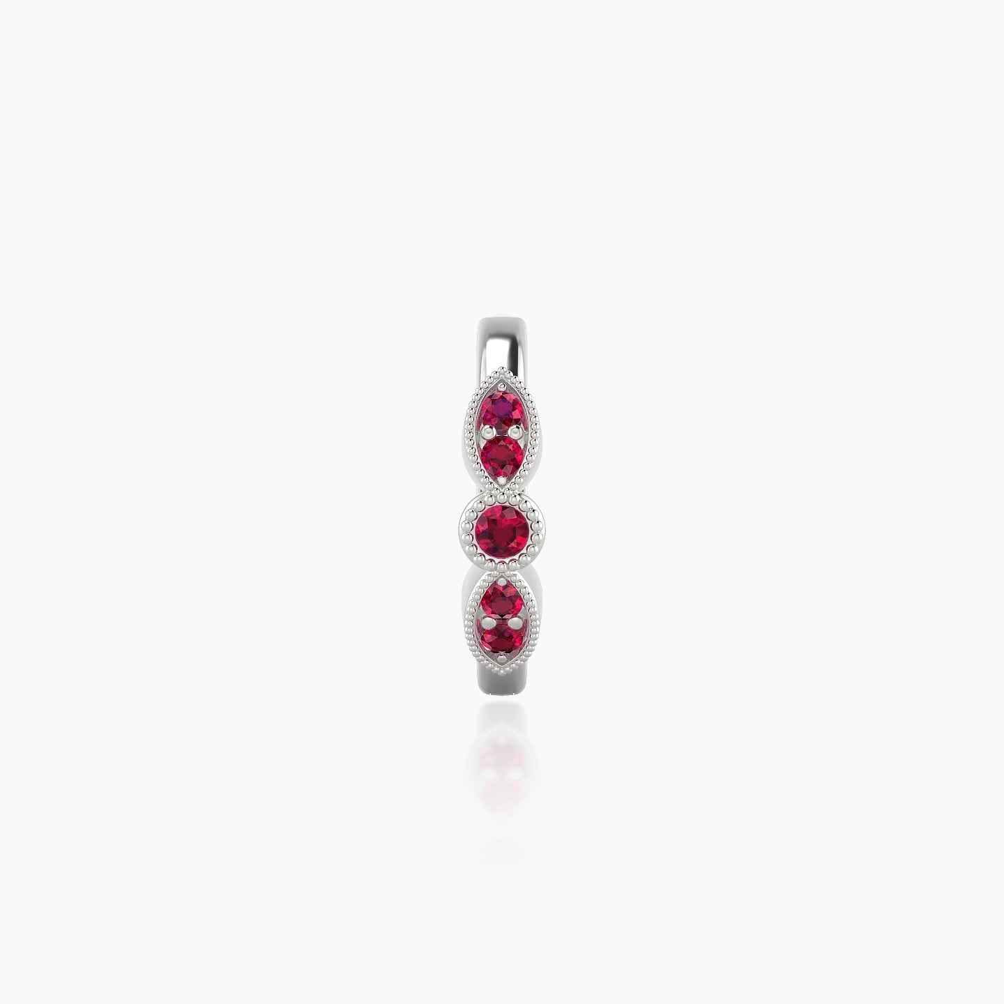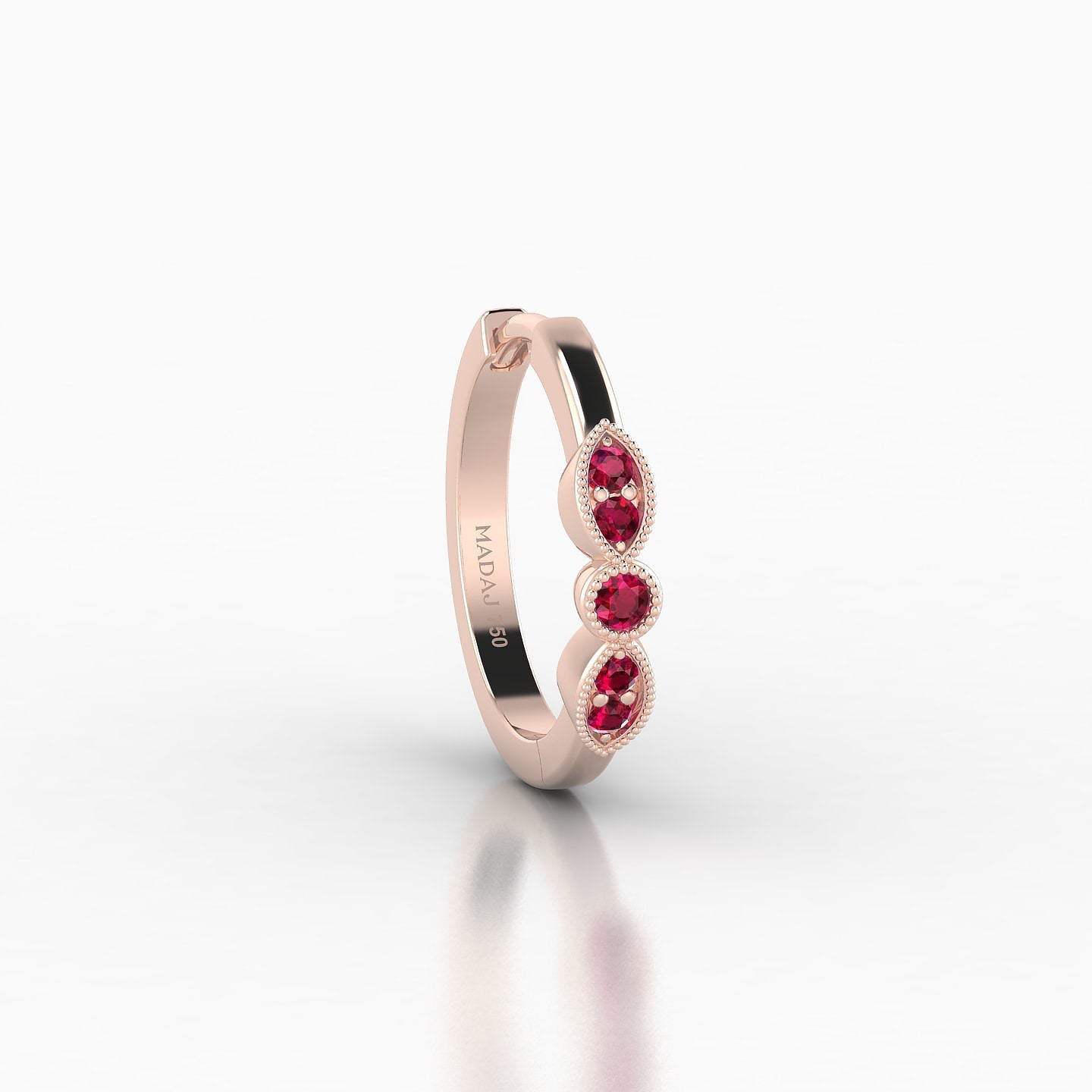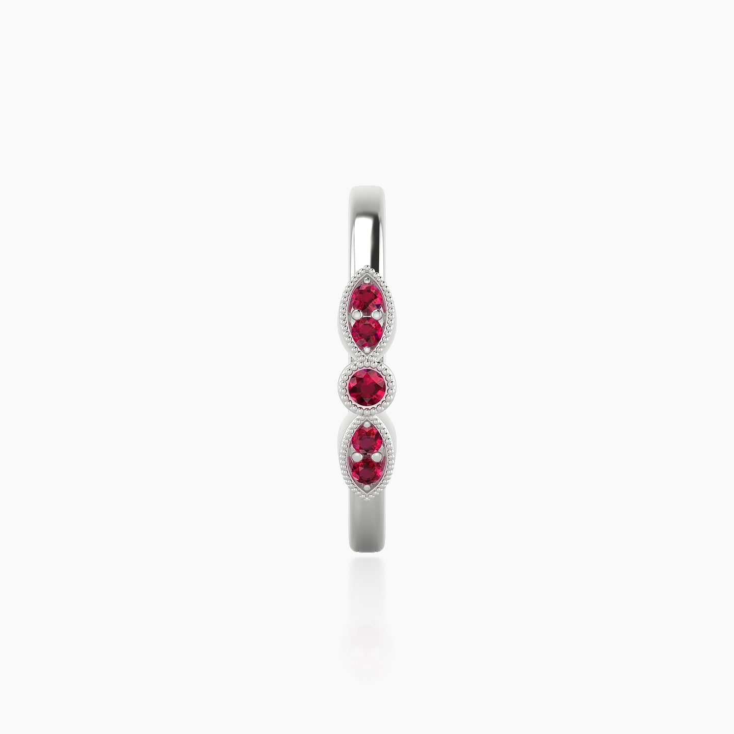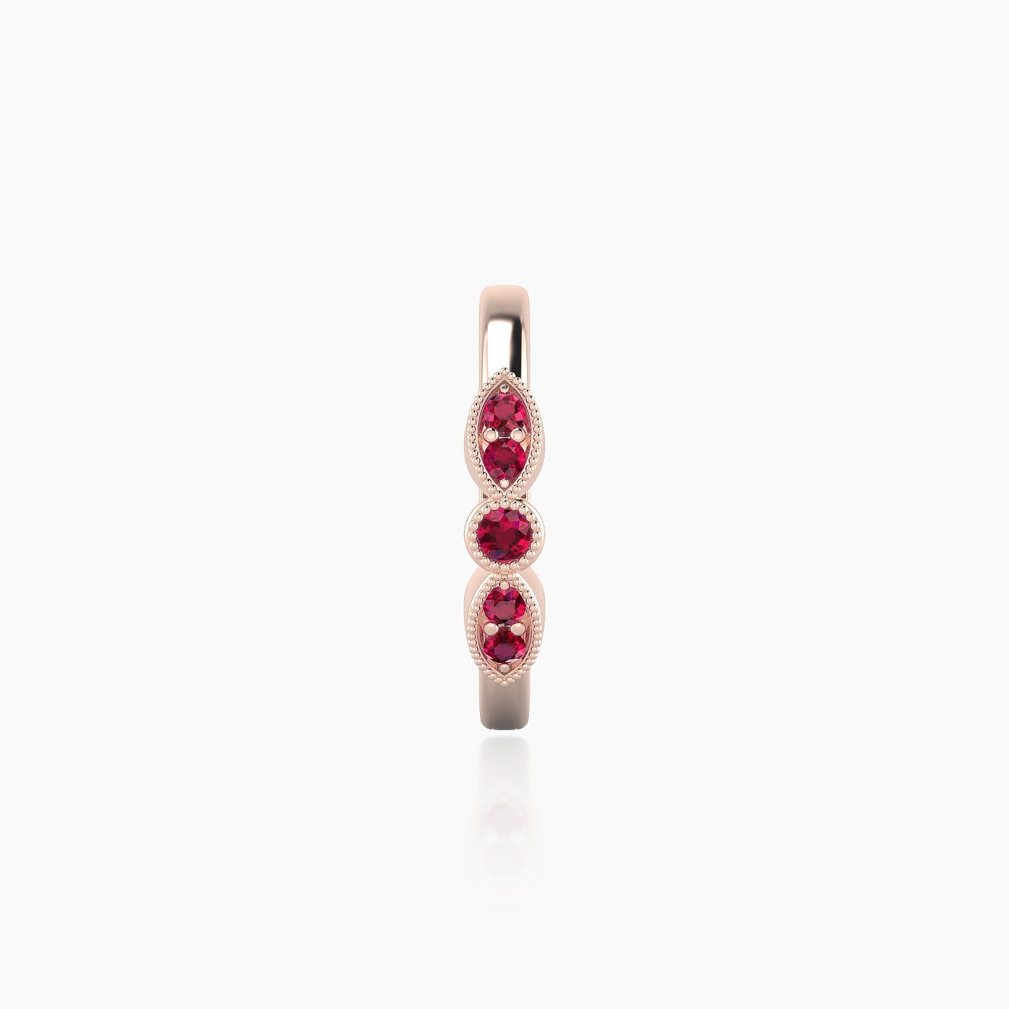 Roma is a hoop piercing crafted from 18k gold and comes in yellow, white, or rose gold. A clicker closure provides both comfort and a sleek, secure hold. The piece features round shape natural rubies, of AAA quality. This piercing can be worn on the lobe, helix, anti-helix, conch, contraconch, rook, tragus, or antitragus.