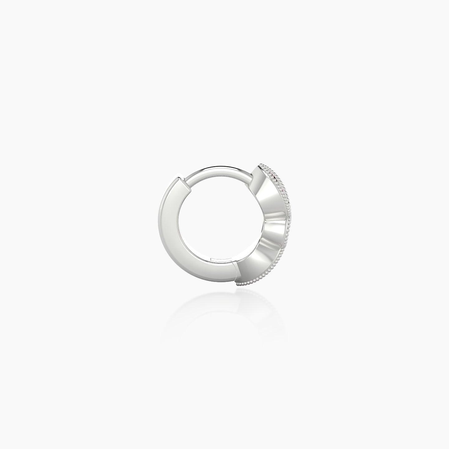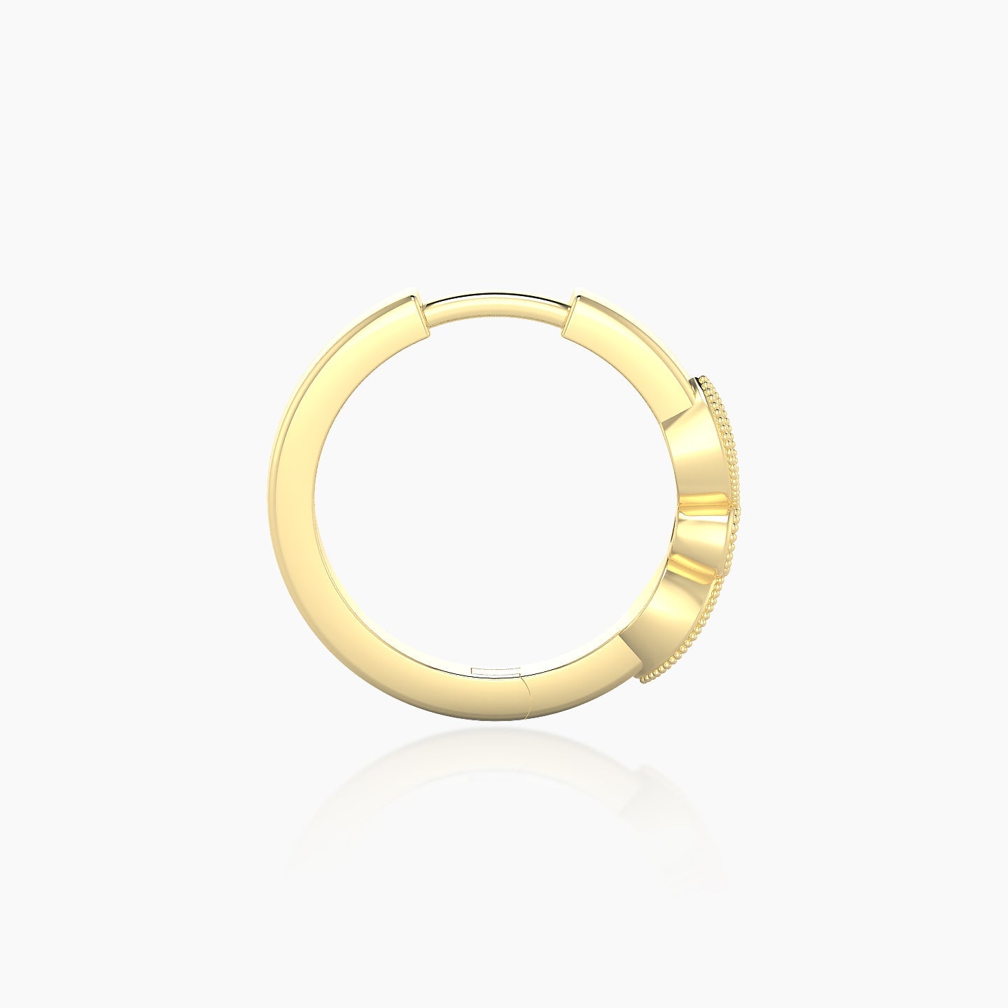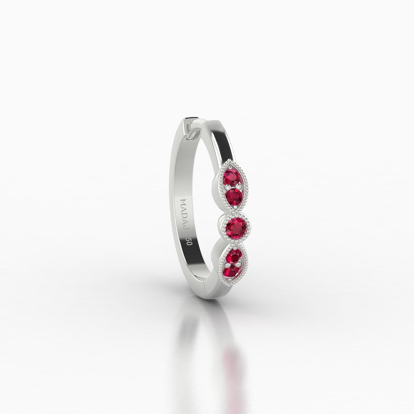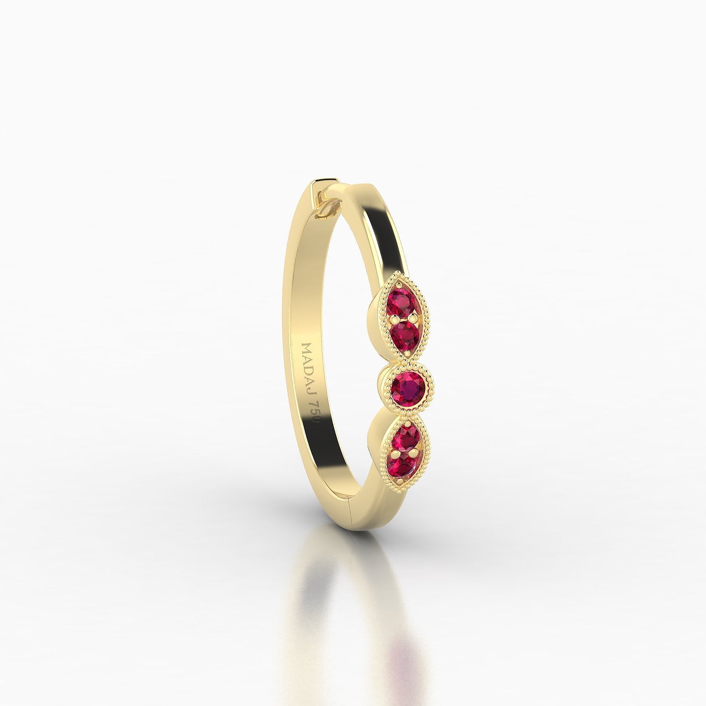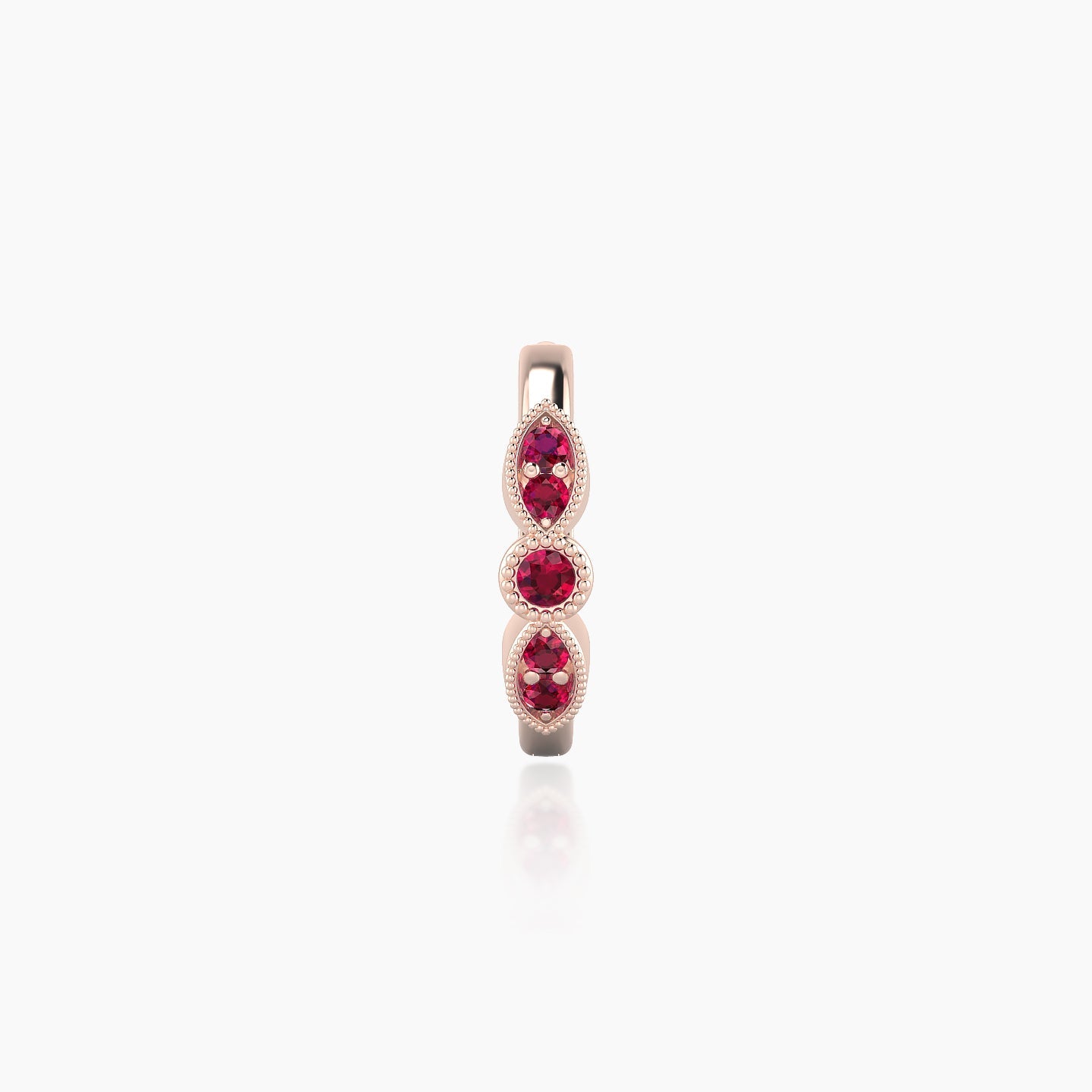 Roma is a hoop piercing crafted from 18k gold and comes in yellow, white, or rose gold. A clicker closure provides both comfort and a sleek, secure hold. The piece features round shape natural rubies, of AAA quality. This piercing can be worn on the lobe, helix, anti-helix, conch, contraconch, rook, tragus, or antitragus.
