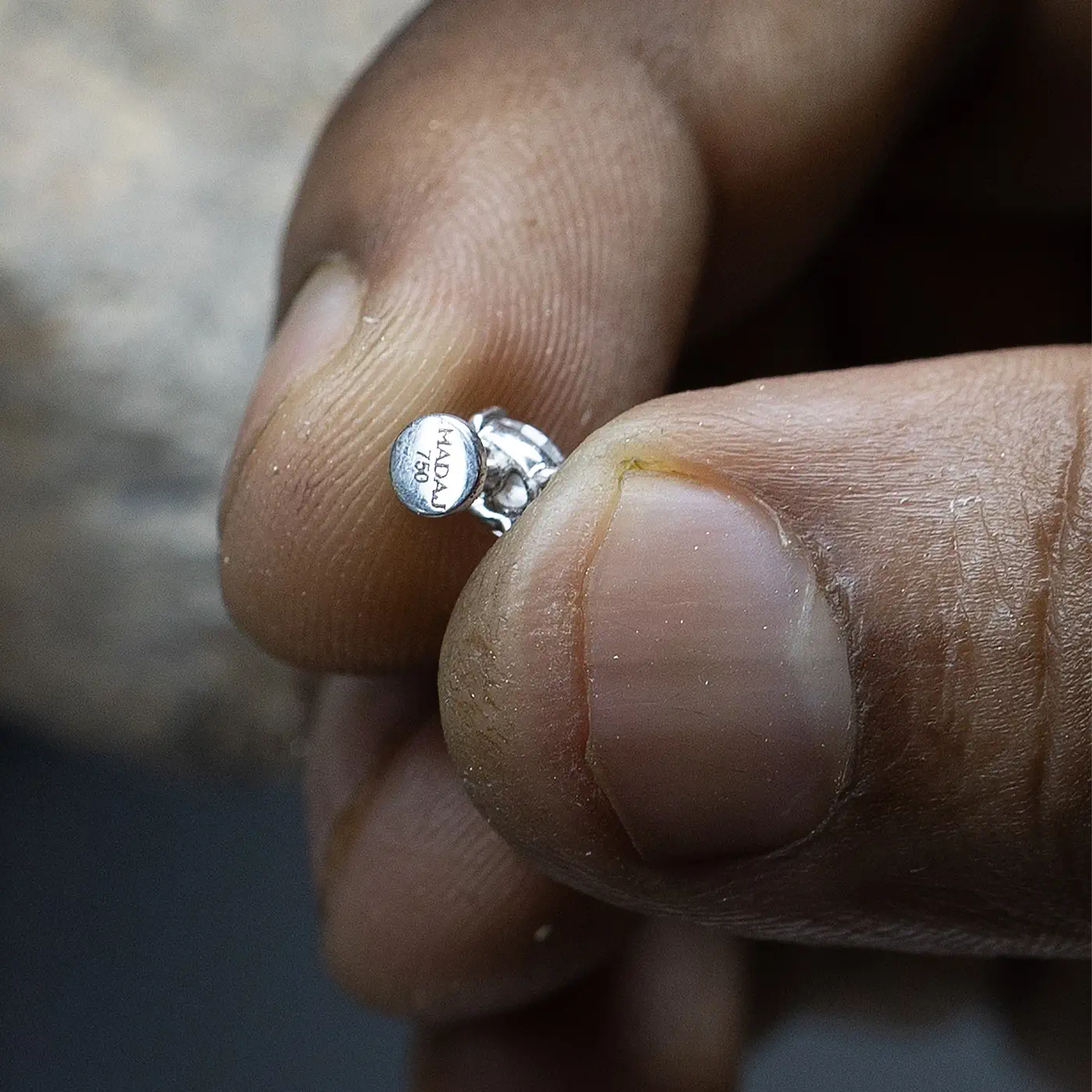 Each piercing is distinctively engraved with the MADAJ logo and stamped with '750' to guarantee its 18-karat gold composition.