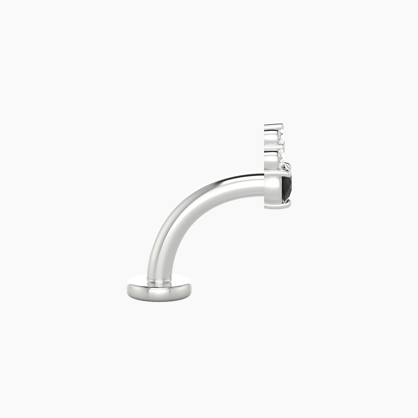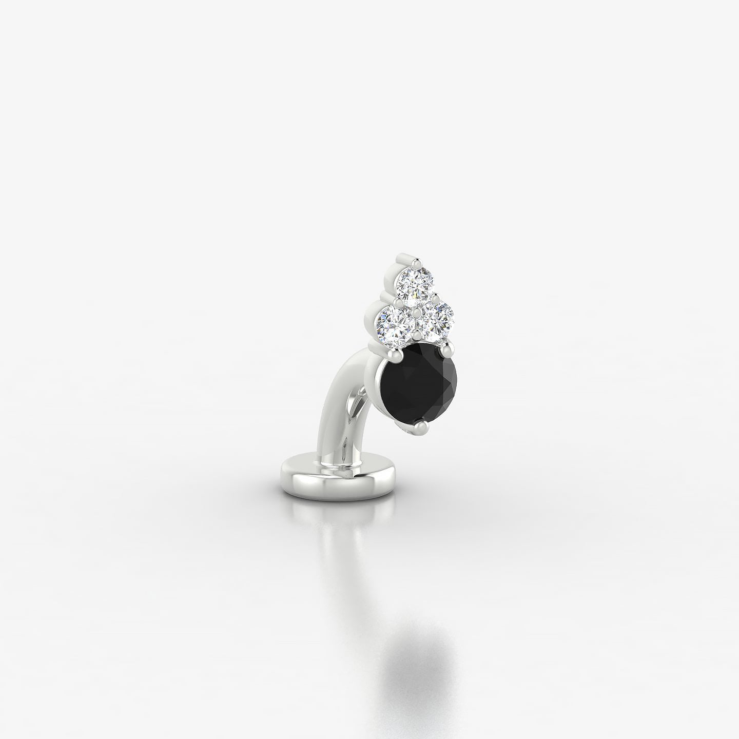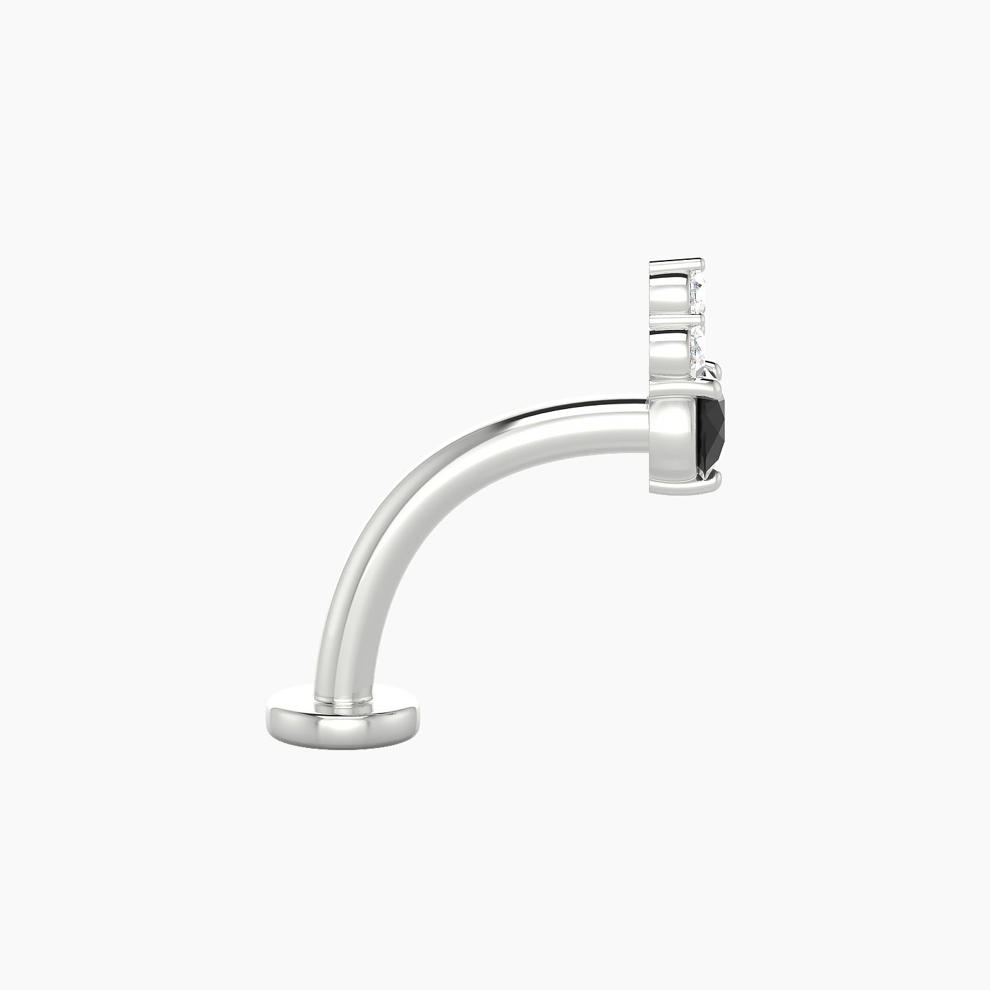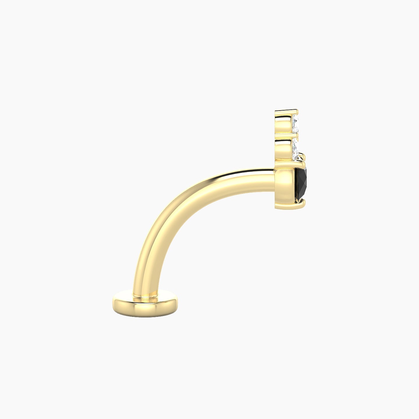 This floating belly piercing, Sif, is made of 18k gold and comes in yellow, white, or rose. It comes with a screw closure system. The piercing is adorned with round shape natural black diamonds and diamonds of AAA and G - VS quality. This piece is made for belly wear and showcases the upper stone above the post.