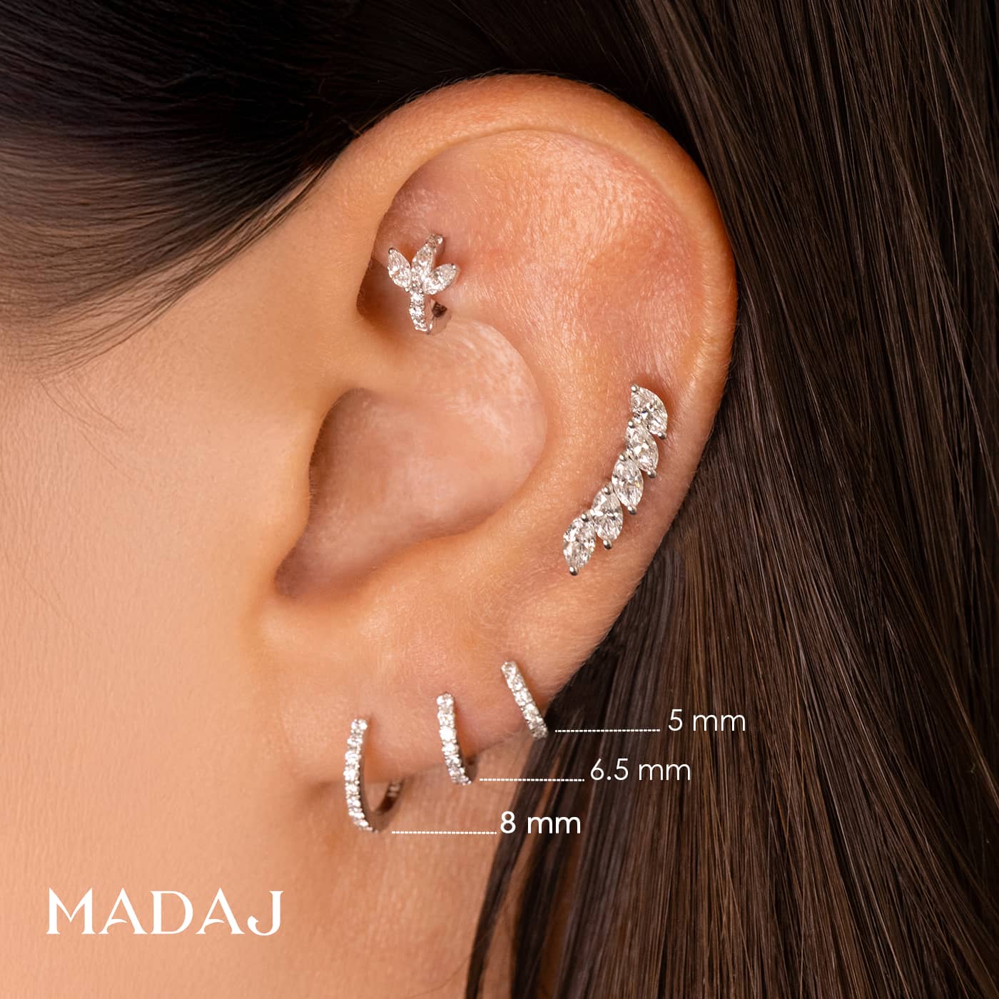 Each piercing is distinctively engraved with the MADAJ logo and stamped with '750' to guarantee its 18-karat gold composition.